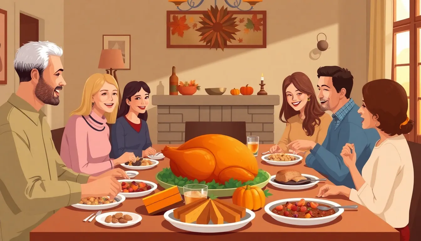 Thanksgiving often highlights family togetherness through shared meals. Families gather around tables filled with turkey, stuffing, and pumpkin pie. Gratitude takes center stage as families express appreciation for one another. Many engage in activities like football games or watching parades, strengthening family ties. Incorporating stories from previous Thanksgivings enhances the joy of the occasion, allowing everyone to reminisce and laugh.